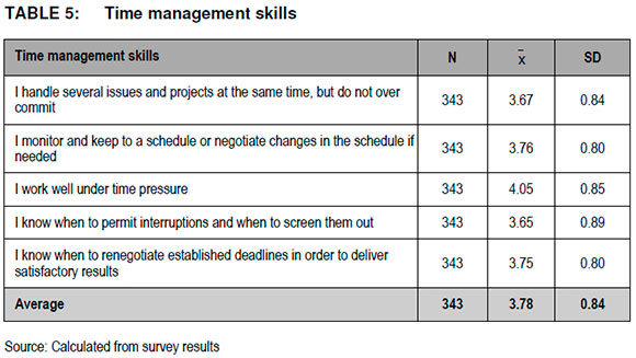 The third objective was to identify managers' time management skills as contributors to their planning and administration competency and the findings are reflected in Table 5.