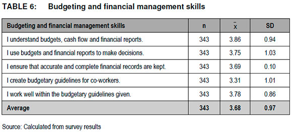 Table 6 depicts an average mean score of χ = 3.68 and SD = 0.97 for the budgeting and financial management construct, indicating that managers are convinced that they have the ability to manage budgets and financial aspects. The mean scores for this construct varied between χ = 3.31 and χ = 3.86 on a five-point Likert scale.