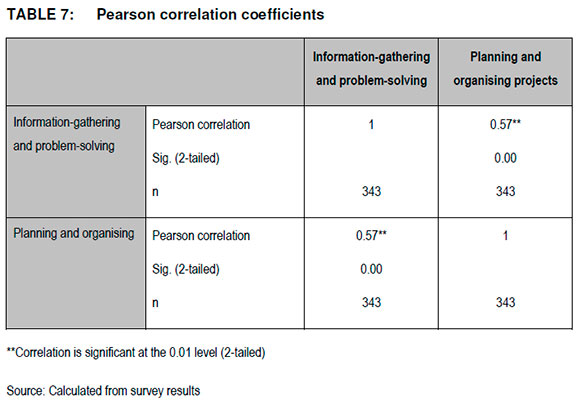 Pearson product-moment correlation coefficients were used to investigate the relation between the two constructs, 'information-gathering' and 'problem-solving', and planning and organising competencies. The results are indicated in Table 7.