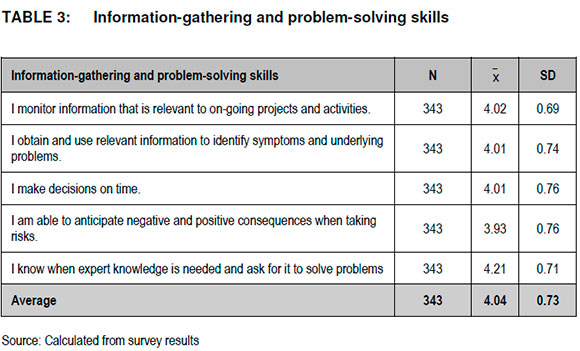 Table 3 shows that the average mean score (x = 4.04; SD = 0.73) with regard to respondents' information-gathering and problem-solving, indicating that top and middle-level managers are of opinion that their planning and administration competencies are on a very good level. Information-gathering includes obtaining resources in order to gain the best value from existing information for a specific purpose. Information-gathering is essential when managers face important decision making within a business (Kuratko 2014:153).