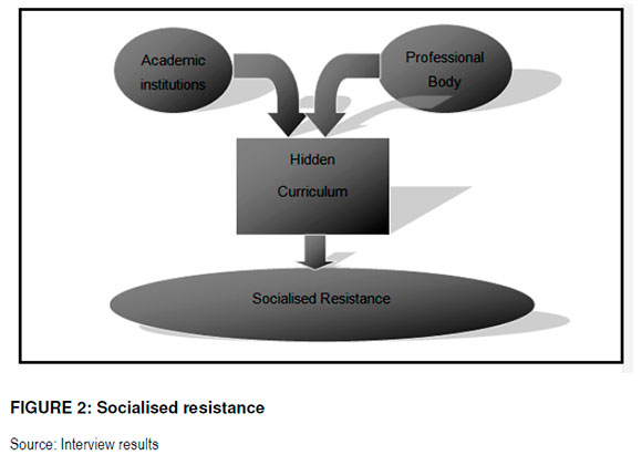 Engineers in Zimbabwe have historically enjoyed a high professional status. They are also groomed to make sure as professionals, they remain autonomous in their operations, meaning resisting any threat to their professional autonomy. In this study, this has been termed socialised resistance whereby pieces of knowledge and beliefs systems are passed on from one generation of professionals to the next. Passive resistance can also be linked to the hidden curriculum as explained in the previous sections. Figure 2 depicts the role of academic institutions and professional bodies in socialised resistance.