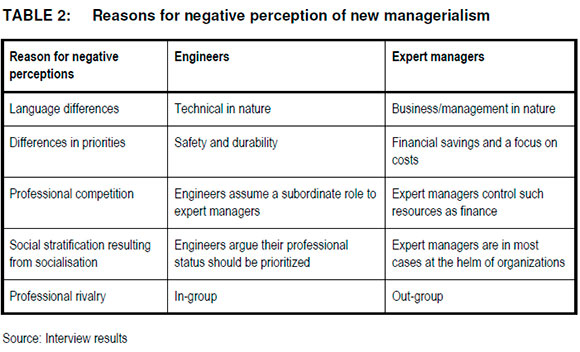 On the other hand, management experts are argued to focus mainly on minimising costs. Professional language was also another difference that emanated from the study between engineers and professional managers. It is evident from the findings that the engineers seem to emphasise differences in technical language as a reason why their profession should not succumb to expert managers. Arguments for the negative perceptions of new managerialism by engineers are summarised in table 2.
