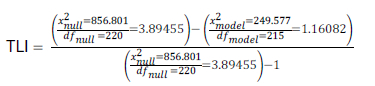Tucker Lewis Index (TLI) = 2.73373/(3.89455-1) = 0.94444