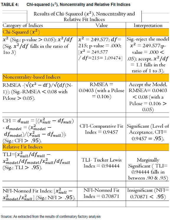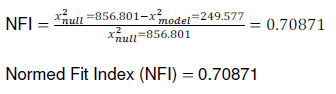 Comparative Fit Index (CFI) indicates good model fitness if it scores > 0.95. In this case, CFI= 0.9457 = 0.95 supports the results of x2/df and RMSEA about the fitness of the model in Figure 1 .However, while also using a criteria of a score > 0.95, it can be noted that the results of Tucker Lewis Index (TLI) is only marginally significant.