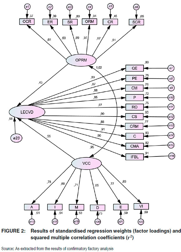 Using a rule of thumb of a score > ± 0.50 as the criteria for assessing statistical significance of factor loadings, it is easily discernible that all these ten variables significantly load onto BVOPRM as the common factor. The statistical face validity of the model is not only demonstrated in the results of standardised regression weights-/?-beta, but also in the results of squared multiple correlation coefficients (r2). It is through r2 that firms are able to measure the statistical importance of each variable as compared to the other variables. It evaluates the degree to which each variable influences the equation and the extent to which a particular construct and other variables would be affected if it was removed.