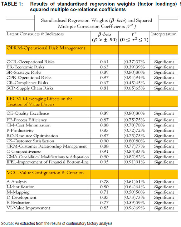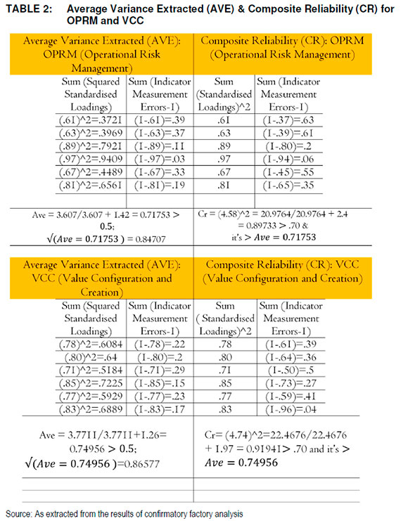 In other words, the results of standardised regression weights-β- (factor loadings) in Figure 2 and Table 1 and squared multiple correlation coefficients (r2) in Table 2 echo the fundamental argument in Figure 1 that if well accomplished, operational risk management leverages a firm's value configuration and creation to create combined value effects that in turn create other business values that catalyse a firm's overall effective market performance. Such a view is further supported in the results of discriminant and convergent validity and reliability using average variance extracted (AVE) and composite reliability (CR).