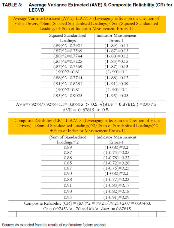 As noted in Table 3, AVE for the construct of the leveraging effects of operational risk management on the creation of value drivers (LECVD) was AVE = 0.87815 > 0.5.