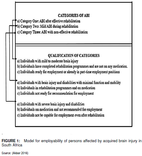 The model depicted in figure 1 has been derived from the data analysis reported on in the study (Akbar 2016:182). The following categories have been formulated in order to assist companies in the employment and sustainability of individuals with ABI in South Africa: Category One consists of ABI after effective rehabilitation; Category Two consists of mild ABI during rehabilitation; and Category Three consists of ABI with non-effective rehabilitation.