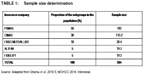 The target population was comprised of one million (1 000 000) members of the five largest medical insurance companies in Zimbabwe namely PSMAS, CIMAS, First Mutual, Fidelity and Altfin (Ministry of Health and Child Care (MOHCC):2014:Interview).Of the 1 000 000 membership, PSMAS accounts for 50 per cent since its beneficiaries are mostly government employees; CIMAS accounts for 30 per cent of the total membership; First Mutual Life caters for 10 per cent of the beneficiaries and Altfin and Fidelity both have 5 per cent (Shamu et al. 2010:5; MOHCC 2014:Interview).
