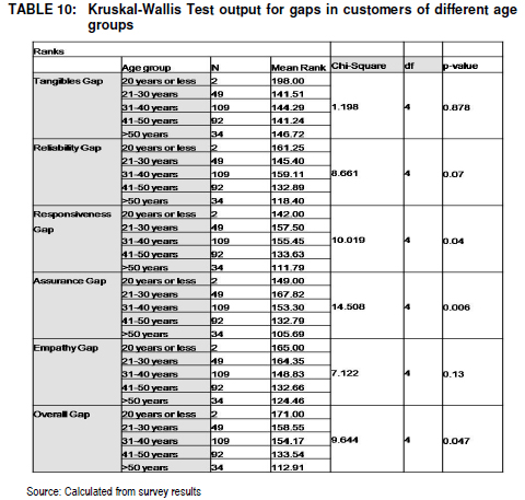 Medical insurance companies should also come up with different medical insurance plans that suit customers in different age groups since they have different service quality expectations. This is because the results of this study indicated that there were statistically significant differences in the responsiveness and assurance Gap scores between customers of different age groups. Furthermore, their service delivery should be designed to cater for the particular needs of clients in different age groups. Medical insurance employees should show more responsiveness and assurance when dealing with the 50 and above age group so that they remain loyal to the company. Likewise employees should also show more empathy when dealing with customers in the <20 years age group.