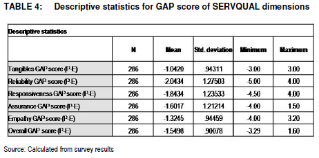 The results on the service quality gaps experienced by medical insurance customers are shown in table 4.
