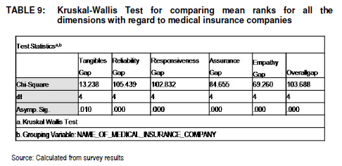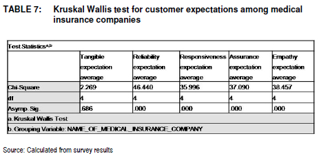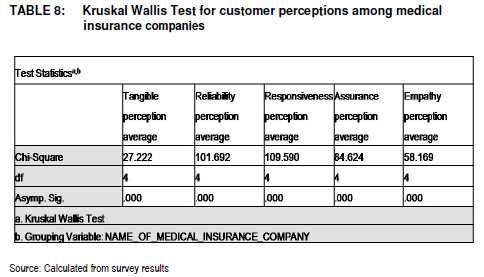 Table 2 shows the results obtained on the medical insurance customers perceptions of service quality variables.