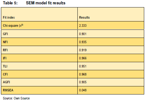 The SEM model fit results are presented in Table 5, all the results met the required thresholds; therefore they all are acceptable and fit the model well.