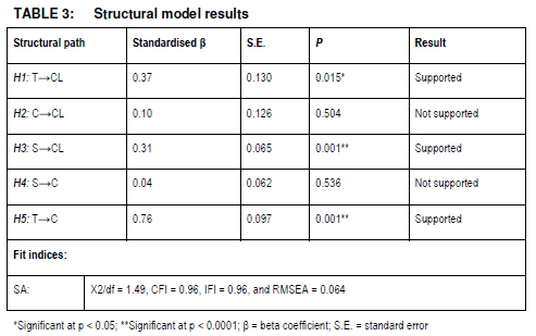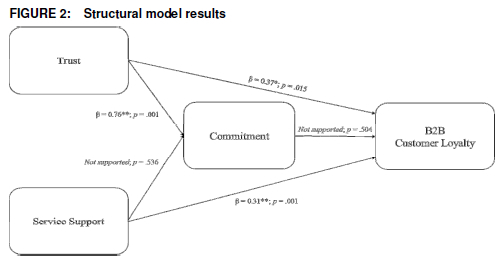 As evidenced in Table 3, acceptable model fit indices were obtained for the structural model assessed (Hair et al. 2010). All standardised regression results are positive. However, only the relationship between trust and B2B customer loyalty, service support and B2B customer loyalty, and trust and commitment are statistically significant at p < 0.05 or p < 0.0001. Therefore, only H1, H3 and H5 could be accepted for this study.