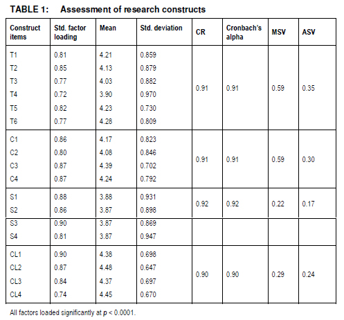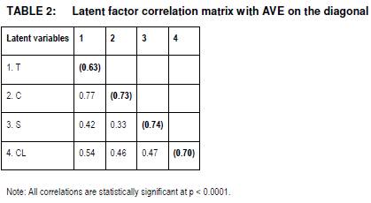 All standardised factor loadings also exceed 0.7, and are positive and significant at p < 0.0001, indicating that the measurement items are well converged among their respective latent variables (Hair et al. 2010). All composite reliability (CR) and values of Cronbach's alpha far exceed 0.7, proving high factor reliability. Considering that all average variance extracted (AVE) values are also above 0.5 (as presented in Table 2), it can be concluded that the research findings provide sufficient evidence of convergent validity of all latent variables examined (Bagozzi & Yi 1988; Byrne 1998; DeVellis 2012; Fornell & Larcker 1981; Hair et al. 2010; Tabachnick & Fidell 2001).