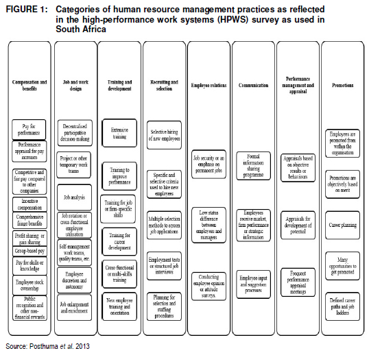 According to Marchington and Wilkinson (2012:4-5), HRM practices are central to improving the capability of an organisation, and thus its particular competitive advantage, enabling the organisation to compete more successfully than other companies for markets and profits in the industry and in the marketplace. This is known in the literature as the "resource-based view" (Barney 1991:99). When these HRM practices are aligned and clustered with the needs of internal and external customers, companies are more likely to succeed contributing collectively to the benefit of the country (Zeuch 2016). This holistic process, which consists of bundles of specific HRM practices, is known as high-performance work practices (HPWPs) or high-performance work systems (HPWSs) (Agarwal & Farndale 2017; Bello-Pintado 2015; Ivars & Martínez 2015; Jeong & Shin 2017; Topcic, Baum & Kabst 2016; Wu, Hoque, Bacon, Lusar & Carlos 2015).