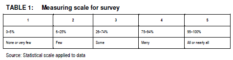 A stratified (industry-based) random sample was used to identify the respondents. Data was collected from a number of industries, such as banking, insurance, textile, sugar, shoe manufacturing and cold drinks. The sampling frame was the Bureau van Dijk Orbis Financial Information System (SA) database (Van Dijk 2011). After eliminating all the companies with fewer than 100 employees, which resulted in a population of 260 companies, only those companies with 100 or more employees were selected for the survey. The reason for this selection was that companies with 100 or more employees could be assumed to have systematic HR programmes (Datta et al. 2005:138). A 60% stratified, random sample was drawn, which resulted in a sample size of 156 companies. After contacting the companies, 12 declined to participate in the survey, which resulted in an adjusted sample size of 144 companies. The major group in the sample was the manufacturing industry (65.8%) while the service/retail sector represented 17.7% of the respondents. The questionnaire was designed with a 5-point Likert-type scale ranging from "none or very few" to "all or nearly all" and it focuses on the extent to which the HPWPs are applied to the staff of an organisation (see TABLE 1).