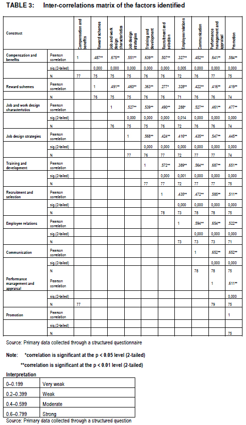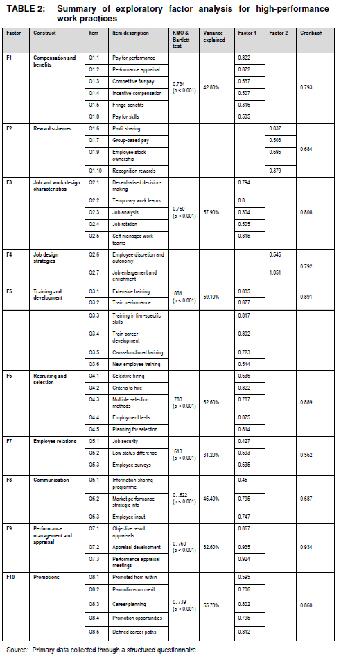 Unidimensionality (the practice is represented by one factor) was confirmed for all HPWPs except for "Compensation and benefits" and "Job and work design" where the eigenvalue criterion (greater than 1) identified two factors in each case. It was decided to rename these factors as follows: Factor 1 - "Compensation and benefits", Factor 2 - "Reward schemes" for the original set of items representing "Compensation and benefits", and Factor 1 - "Job and work design characteristics" and Factor 2 - "Job design strategies" for the original set of items representing "Job and work design". The Cronbach's alpha values were all above the recommended exploratory threshold of 0.6, except for the statement "Recognition rewards", which measured 0.379. As it represented a specific important component within the HPWP bundle, it was decided to retain this statement for the study. As this study was exploratory, the use of a lower limit for Cronbach's alphas (0.60) was acceptable (Hair et al. 2010). For the exploratory research, all the constructs thus showed internal consistency (reliability) except for the item mentioned earlier (re: recognitions rewards). A total of 10 factors were identified (see TABLE 2).