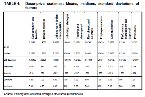 From the table, it is clear that there was a dominance of positive correlations, which varied from weak to strong, which were all significant. For example, a strong correlation (.687) was found between performance management and training (p < 0.01 level), which makes sense, as training has a major influence on the performance of employees, while a weak correlation (.277) was found between selection and reward schemes (p < 0.05 level), which also makes sense, as these two aspects do not have anything directly in common with one another. At a deeper level, it is clear from TABLE 3 that all the factors, although they are all each distinct in their own right, have some form of relationship, which varies in intensity, with a correlation coefficient of between 0.684 and 0.934. The means, medians and standard deviations for the factors are shown in TABLE 4.