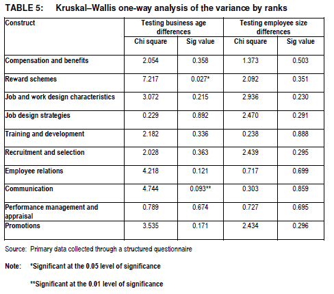 To test for significant differences between the factors as far as the size (number of employees) and age of the companies (years of existence) are concerned, the Kruskal-Wallis one-way analysis of variance ranks test was used, due to the small number of companies in each age and size category. For the size of the companies, the following categories were used; fewer than 200 employees (N=29), 201 to 499 employees (N=30), and 500 and more employees (N=20). For the age of the companies, the following categories were used: 0 to 20 years (N=32), 21 to 30 years (N=18), and 31 years and older (N=27) and missing data (2). The results indicate that, at the 5% level of significance, no statistically significant difference existed between the three employee groups in relation to each of the HPWP factors. Furthermore, with regard to the age of the companies, no statistically significant differences between the three company age groups existed in terms of eight of the HPWP factors. However, with regard to the "Reward schemes" factor, a statistically significant difference existed between the company age groups. The mean ranks indicate that, at the 5% level of significance, the young companies (20 years or younger) were more inclined to report that this practice applied to more employees (mean rank=45.63) than the companies that were older than 30 years (mean rank=35.33). The reason for this could perhaps be that the younger companies were still finding themselves in a growth phase and thus needed to motivate those employees who excelled at their work and contributed to the growth of the company. In addition, at the 10% level of significance, with regard to communication, a statistically significant difference existed between the company age groups. The mean ranks indicate that the older companies (30 years or older) tended not to have these communication practices in place for many employees (mean rank=31.74) versus the two younger company age groups (mean ranks of 40.61 and 44.22 respectively). As mentioned earlier, the younger companies were perhaps experiencing a growth phase and proper communication between all employees was important in order to enable the employees to focus their energy on the goals of the organisation. On the other hand, in the case of older companies, as they reached maturity, they became more complacent and breakdowns in this area started to appear with them developing a bureaucratic structure. This could perhaps be linked to the lower presence of job and work design characteristics, as indicated earlier in the findings. The foregoing discussion thus answers the third and last goal of the study.