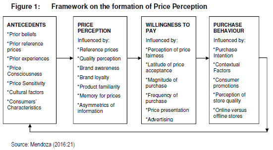 The article is underpinned by the price perception framework developed by Mendoza and Baines (Mendoza & Baines 2012:Internet; Mendoza 2016:20). The choice of the framework is influenced by its axiomatic nature and its incorporation of a diversity of theories in explaining price perception. The framework was supported by various theories, namely mental accounting, prospect theory, range theory, anchoring theory, adaptation-level theory and range-frequency (Mendoza 2016:26). The theoretical framework is shown in Figure 1.