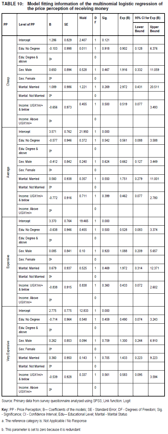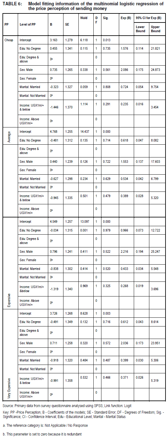 The dependent variable (perception of the pricing structure of mobile money) is polynomial in nature where an individual is offered four options to categorise the pricing structure of mobile money. The parameters of the model were estimated using the Maximum Likelihood (ML) technique using SPSS (Statistical Package for Social Sciences) version 20.