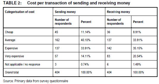 As shown in Table 2, most respondents (40.10%) reported that the cost of sending money was average while 33.91 percent perceived it to be expensive. Similarly, most respondents (35.15%) perceived the cost per transaction of receiving money to be expensive while 33.91 percent reported that cost of receiving money was average.