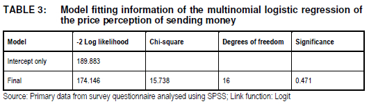 Table 3 shows the model fitting information for the multinomial logistic regression of the price perception of sending money across mobile money platforms. It indicates the parameters of the model for which the model fit is calculated. The "intercept only" describes a model that does not control for any predictor variables and simply fits an intercept to predict the outcome / dependent variable. The "final" describes a model that includes the specified predictor variables and has been arrived at through an iterative process that maximises the log-likelihood of the outcomes seen in the outcome / dependent variable.