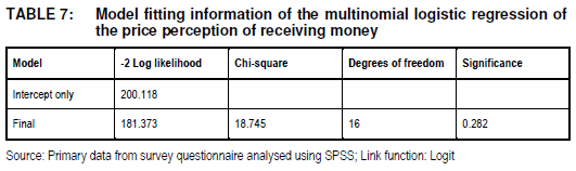 Table 7 shows the model fitting information for the multinomial logistic regression of the price perception of receiving money across mobile money platforms. Addition of the predictors to a model that contained only the intercept did not significantly improve the fit between model and data, χ2 (16,404) = 18.745, Nagelkerke R2 = 0.049, p>0.05 (Table 8).