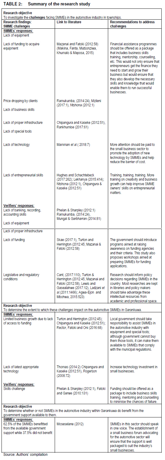 In Table 2 a summary is provided of the research objectives, the research findings in terms of the challenges facing SMMEs and the link to the literature review. From this summary, the recommendations to address the challenges faced by SMMEs in the automotive industry are compiled.