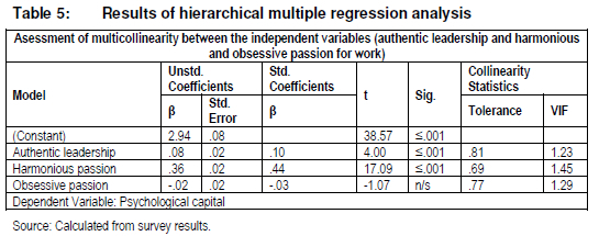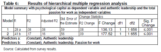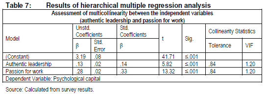 The stepwise multiple regression analysis, with PsyCap as dependent variable and AL as independent variable, yielded significant results. The model improved with the addition of harmonious passion for work. AL explains 8% of the variance in PsyCap (F(1, 1 665) = 137.22, p < .001), with 15% explained by harmonious passion for work (F(1, 1 664) = 330.785, p < .001). Obsessive passion for work did not contribute significantly to the model. This result is consistent with Vallerand and Houlfort's (2003) study which found that obsessive passion was generally unrelated to positive affect. The total model (consisting of AL and harmonious passion) explains 23% of the variance in PsyCap.