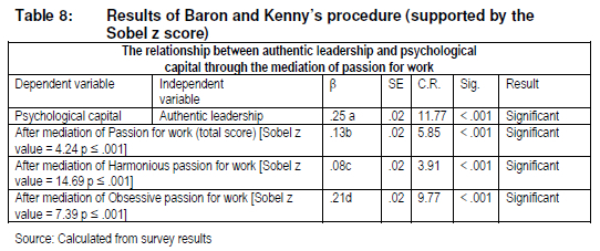 After inspection of the results reported in Table 8, it is clear that a mediated effect (b, c, d) and direct effect (a) exist and point in the same direction. The estimated beta value of the relationship between AL (independent variable) and PsyCap as dependent variable was .25, but decreased to .13 after PfW was introduced as mediating variable. The largest mediation took place with the inclusion of harmonious passion for work, decreasing the estimated beta value to .08. This is also referred to as complementary partial mediations or as "consistent" or "positive confounding" models (Zhao et al. 2010:200). This finding is supported by all the Sobel z scores ranging from 4.24 (in model a) to 14.60 (in model c) (p < .001) respectively.