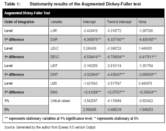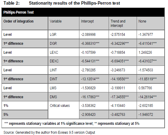 The results of the unit root tests are presented in Table 1 below and show that when considering the ADF test, the variables GR and MS were stationary at level series while the variables EXC, CPI and REPO were not stationary at level series but became stationary after first difference. When using the PP test, all variables were stationary after first difference except for the variable CPI that was stationary at level series. Considering the results of the much stricter PP test, variables were thus integrated of order 0 and 1.