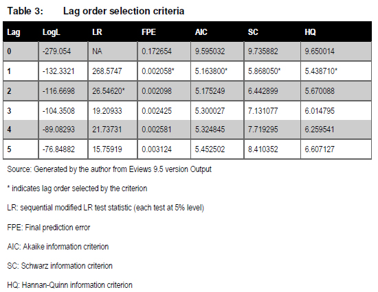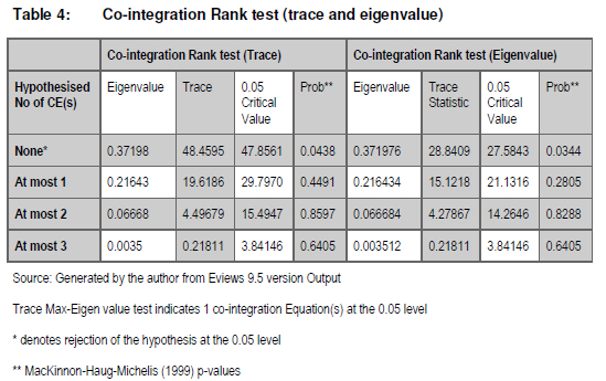 Table 3 above confirms that the criteria selected 1 lag. Subsequently, making use of the information criteria approach, the Johansen co-integration test was conducted using 1 lag for the VAR. The trace test results based on the Johansen co-integration are presented in Table 4.