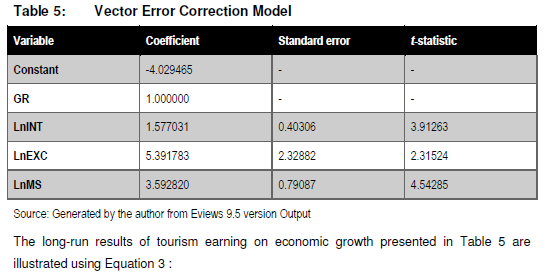 The discovery of a co-integrating equation necessitated the use of the VECM. The distinction between the long- and short-run impacts of the variables established the extent of influence that the tourist receipts had on economic growth. The VECM results are presented in the Table 5.