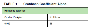 Table 1 illustrates the Cronbach Coefficient Alpha result which was the instrument utilized to calculate the reliability of the study. A total of 56 items were tested, which yielded a Cronbach Alpha of 0.932. Hence the research instrument, namely the questionnaire, has a high degree of reliability and an acceptable level of inter item consistency.