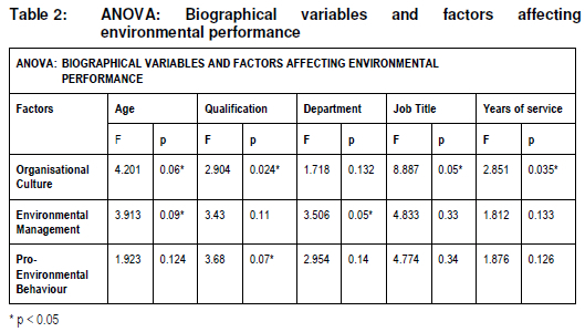Table 2 depicts that there is a significant difference in the perceptions of employees varying in age, qualification, job title, years of service and organisational culture, environmental management and pro-environmental behaviour at the 5% level of significance, however not all the biographical variables have proven to influence the factors, hence the following hypothesis are partially accepted:
