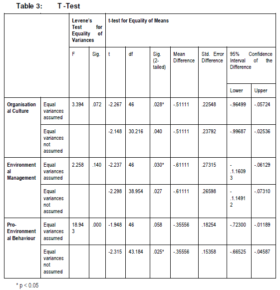 Table 3 depicts that there is a significant difference in male and female employee's perceptions of organisational culture, environmental management and pro-environmental behaviour to positively affect environmental performance, at the 5% level of significance, hence hypothesis 4 namely, there is a significant difference in the perceptions of male and female employees regarding the key dimensions (organisational culture, environmental management and pro-environmental behaviour) having the potential to affect environmental performance is accepted.