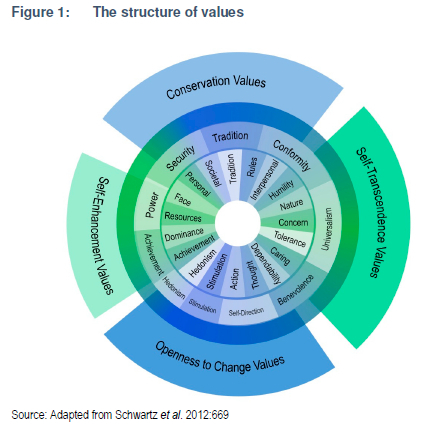 The use of both value content and structure are important (Schwartz 1996:124; Schwartz et al. 2017:252). Schwartz (1996:140) contends that research using a selection of singular values to predict behaviour ignores other values that may be meaningful in the relationship. By doing this, these approaches provide useful information, but fail to offer coherent theory. Values research within the ethics decision making and business-society fields often takes a single-value approach (e.g. Berson et al. 2008:619; Hood 2003:266; Watson & Berkley 2009:469) with a few notable exceptions (Adams, Light & Sagiv 2011:1345; Fritzsche & Oz 2007:336). However, attitudes and behaviours are guided not by the priority given to a single value but to the trade-offs made among competing values and groups of values (Schwartz, Cieciuch, Vecchione, Torres, Dirilen-Gumus & Butenko 2017:252; Skimina, Cieciuch, Schwartz, Davidov & Algesheimer 2018:45).