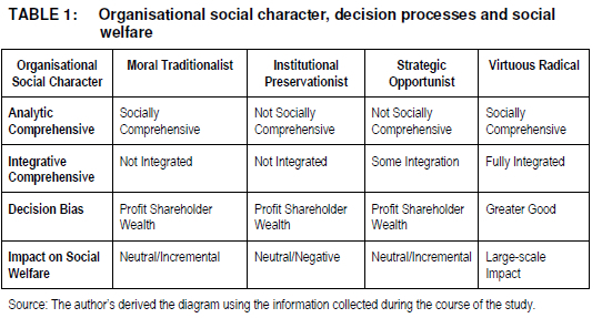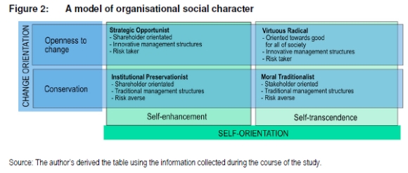 Based on the idea that executives vary in their value structure, and that these values can permeate through the organisation's strategy and structural elements, organisations can be categorised according to these value structures. The two underlying value dimensions described above are used as the basis for the model of organisational social character presented in Figure 2. Although the four typologies are based upon a continuum of values, they appear to have enough distinct elements to result in divergent decision-making processes and outcomes. Further, unlike the manifestation of these values at the individual level, where a reflection of conflicting values would not be expected (Schwartz 1996:124), the organisational social character is taken to comprise different combinations of these values.
