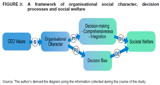 This assumption underscores the "P" process relationship of the model, indicating that CEO values impact organisational decision processes via organisational social character. Decision processes are important channels through which executives influence organisational outcomes. A key way in which this occurs is through organisational sense making processes adopted by an organisation, which affect how members of the organisation interpret situations (Daft & Weick 1984:286), and how relationships with stakeholders, and responses are formed (Basu & Palazzo 2008:124; Brickson 2007:872; Richter & Arndt 2018:593). The P arrows present the argument in the context of business and society relationships that different organisational social character typologies are associated with divergent decision processes and decision bias.
