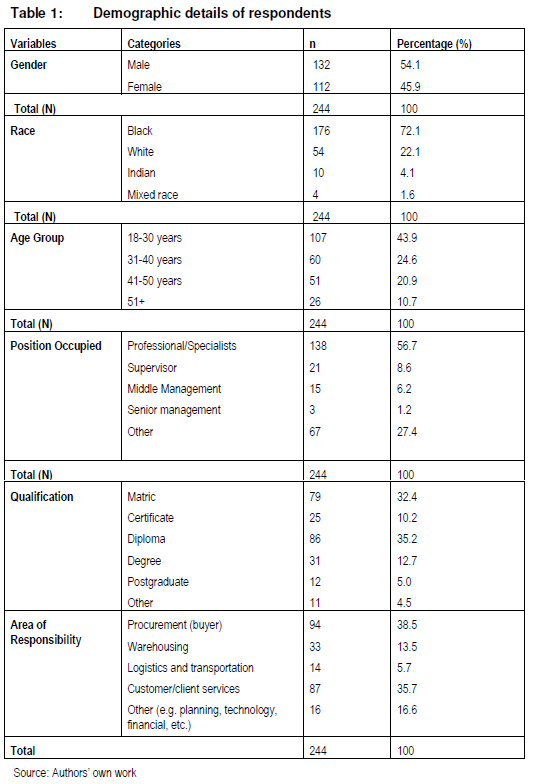 Table 1 provides the demographic results of the respondents. Of the 244 respondents, the majority were male (54%; n=132). Regarding racial profile, blacks were the most represented race in the sample (72%; n=176). After collapsing the ages into separate groups, it was found that most respondents were aged between 18 and 30 years (44%; n=107). As regards the positions held, the majority of respondents (57%; n=138) were in the professional/specialist category. With respect to qualifications, the largest group of respondents (35%; n=86) were holders of diplomas. Additionally, the largest group of respondents (38%; n=94) were employed in procurement divisions, followed by those who were in customer/client services (35%; n=87).
