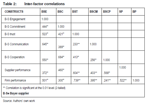 The convergent validity of research instruments is determined by the factor loadings of each item on the scale, which should be equal to or greater than 0.5 (Anderson & Gerbing 1988:411). The analysis offered the following readings: buyer-supplier engagement (BSE1= 0.78; BSE2= 0.71; BSE3= 0.64; BSE4= 0.60; BSE5= 0.71); buyer-supplier commitment (BSC1=0.56; BSC2=0.63; BSC3=0.59); buyer-supplier trust (BST1= 0.65; BST2= 0.51; BST3= 0.59; BST4= 0.72); buyer-supplier communication (BSCM1=0.54; BSCM2=0.67; BSCM3=0.63; BSCM4=0.64; BSCM5=0.60); buyer-supplier cooperation (BSCP1= 0.59; BSCP2= 0.69; BSCP3= 0.70; BSCP4= 0.74; BSCP5= 0.67); supplier performance (SP1= 0.72; SP2= 0.62; SP3= 0.52; SP4= 0.63); and firm performance (BP1= 0.58; BP2= 0.78; BP3= 0.68; BP4= 0.61; BP5= 0.70; BP6=0.55). These figures reveal that factor loadings for all measurement scales met or exceeded the cut-off threshold of 0.5. This means that each item measured at least 50% of what it was expected to measure and all of them converged well with their respective variables. Discriminant validity was established through inter-factor correlations. Correlation values less than 0.85 depict that discriminant validity exists between the scales since the constructs do not overlap each other and are measuring different things (Fornell & Larcker 1981:39). The results of the correlation analysis are presented in Table 2.