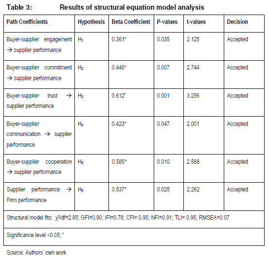 The results of the inter-factor correlation analysis further revealed that the constructs considered in this study are positively and significantly associated. These results demonstrate that the constructs tested are positively associated such that an increase in one results in the positive increase of the others. The highest correlation coefficient was calculated between buyer-supplier trust and firm performance (r=0.737), which illustrates that the strongest association existed between these two constructs when compared to the others.