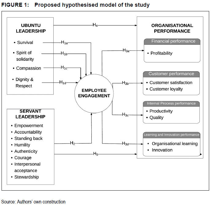 Covey (2006:5) rationalised that servant leadership is appropriate for South Africa, since the model is characterised by moral authority, humility, service and sacrifice that bring about trust and respect. Servant leadership models have been cited as good reference point for contextualising the Ubuntu concept (Brubaker 2013:99). The sheer intensity by which values are exhibited by African people living Ubuntu, however, differentiates Ubuntu from similar leadership styles. The major contribution of this study is the novel approach of utilising the indigenous knowledge-system of Ubuntu, as well as servant leadership, to improve employee engagement and organisational performance. The first part of this article covers the problem statement, objectives, hypothetical model of the study and the hypotheses. Thereafter, a theoretical overview and the research methodology are provided. The last part highlights the main empirical results, conclusions and recommendations, and recommendations for future research.