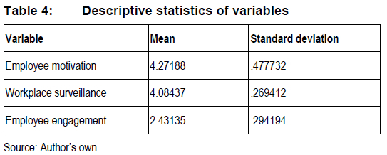 The research constructs had the following Cronbach alpha values: workplace surveillance had 0.765, employee engagement had 0.768 and employee motivation had 0.913. The Cronbach's alpha value for the three constructs was 0.778, which suggests good internal consistency of the questionnaire items for the three constructs. Thus, out of the 80 statements for the three constructs, none was deleted.