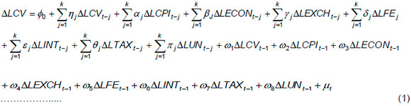here ΔLCV refers to the change in the natural logarithm of the consumer vulnerability index, ΔLCPI refers to the change in the natural logarithm of the consumer price index, ΔLECON to the change in the natural logarithm of gross domestic product per capita, ΔLEXCH to the change in the natural logarithm of the real effective exchange rate, ΔLFE to the change in the natural logarithm of fiscal expenditure levels, ΔLTAX to the change in the natural logarithm of tax revenue levels, ΔLINT to the change in the natural logarithm of real interest rate, ΔLUN to the change in the natural logarithm of the broad unemployment rate and μt the error term. In addition, k denotes the number of lags included in the model while πj,aj,βj,γj,δj,εj, 0j,πj represents the short run dynamics and ω1,ω2...ωn shows the long run coefficients. Based on this equation, the following hypotheses were set in order to test if the included variables in the model do co-integrate: