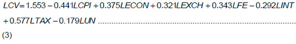 The initial step in the analysis comprised a correlation analysis between the variables. This analysis was chosen with the purpose to ascertain a simplistic view on the relationship inherent between the dependent and independent variables. Table 2 below indicates the results for the correlation analysis. From the table, it shows that there exist weak to medium positive and significant associations between the consumer vulnerability index and levels of fiscal expenditure (sig. = 0.0027), tax revenue collection (sig. = 0.0009) as well as economic growth (sig. = 0.0022). On the other hand, the relationships between the LCV and LCPI and LEXCH were considered to be negatively weak and non-significant. These negative associations were also estimated between LCV and LUN as well as LINT; however these exuded a somewhat stronger and more significant association.