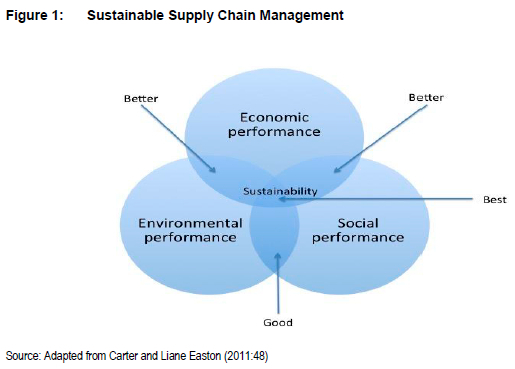 Sustainable supply chain management is centred around the notion of the TBL, which indicates that in order for a supply chain to be fully sustainable, an organisation must consider the economic, environmental and social dimensions of its activities (Carter & Liane Easton 2011:46; Esfahbodi et al. 2016:350). Figure 1 below indicates the integration of the TBL of sustainability into SSCM.