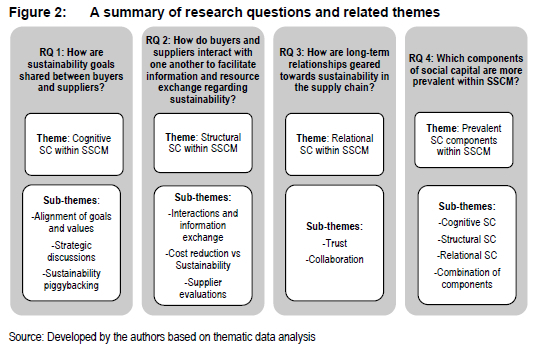 This study considered three (3) components of social capital to examine the role that buyer-supplier relationships play in SSCM. These components constitute the main themes of the study, which enabled each research question to be answered. The identified themes and sub-themes about each research question are indicated in Figure 2 below. The following sections discuss each theme in more detail.